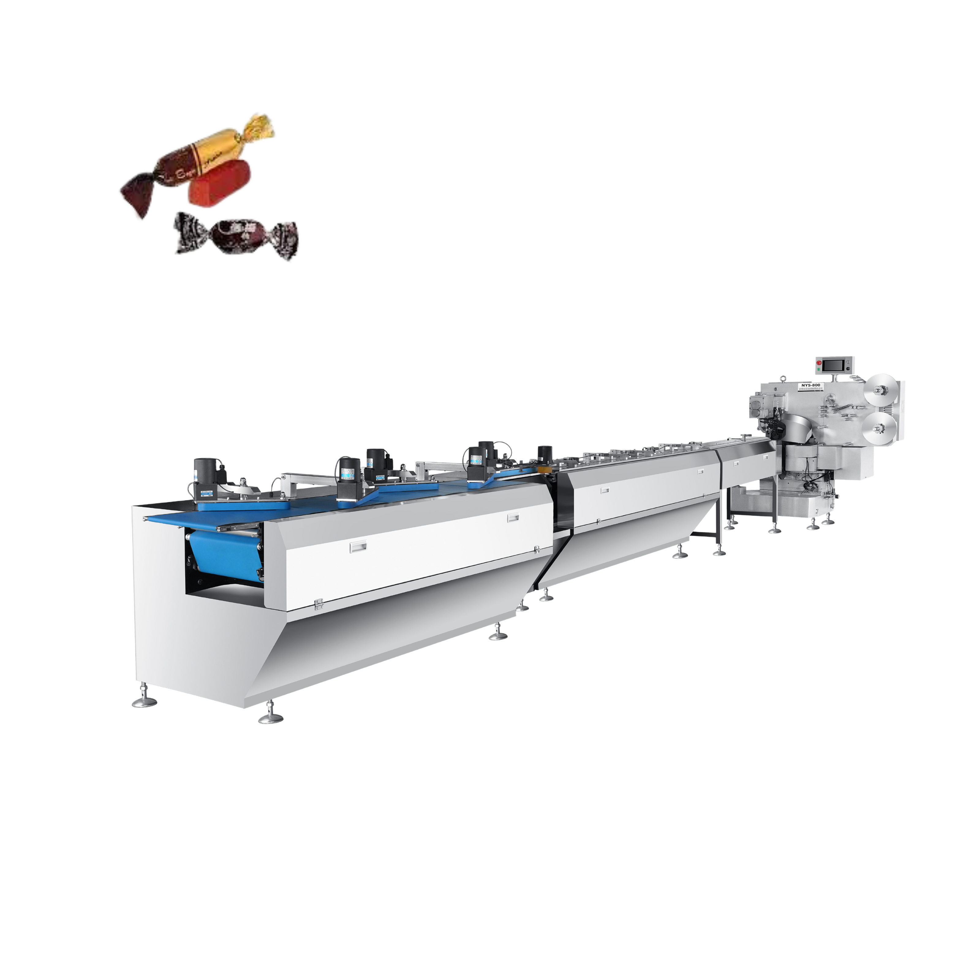 This Machineis suitable for the automatic aligning and double twist wrapping of candies, chocolate, nougat , coated confections and other products with fragile, easily damaged surfaces. It can be seamlessly integrated with large production lines to achieve fully automatic production. This machine can reach a packaging speed of up to 400 bags per minute, with 100% packaging rate and no empty packages. It features an aesthetically pleasing design, innovative structure, easy operation, smooth running, high efficiency, labor saving, low noise, low failure rate and easy cleaning and maintenance.